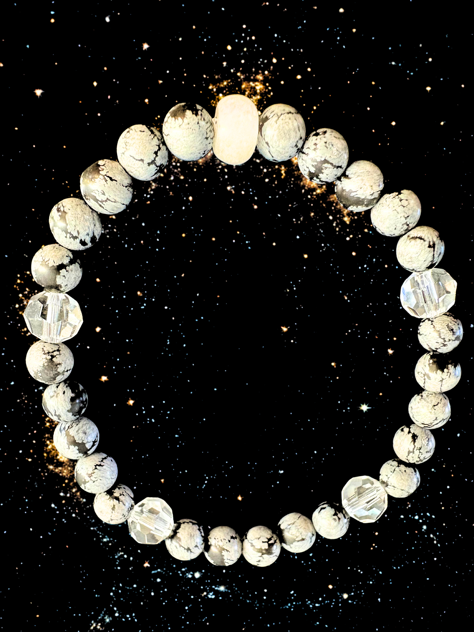Crafted with snowflake obsidian, this bracelet mirrors a calm winter sky — dark and grounding, yet flecked with patterns that resemble falling snow. Crystal accents glimmer like starlight, and a single snow quartz bead at the center brings a sense of peace and completion.
